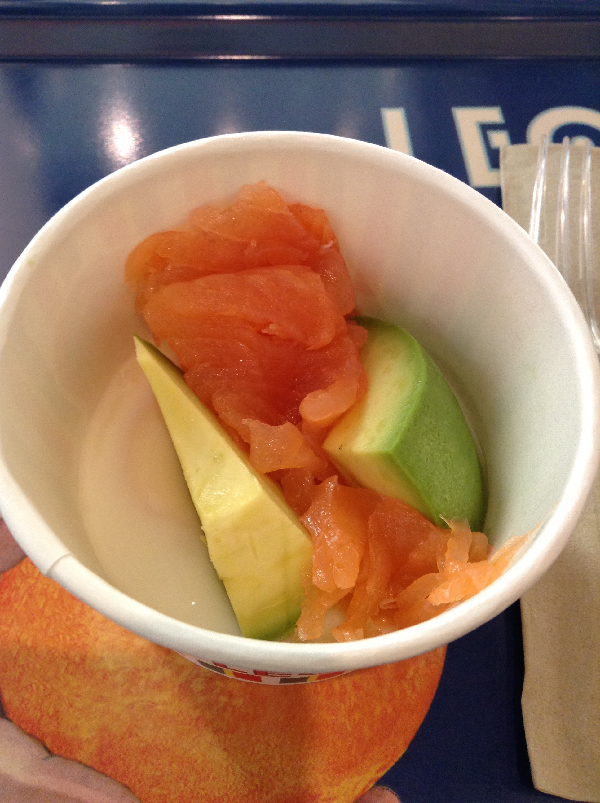 Salmon, avocado, and a poached egg in a paper cup.