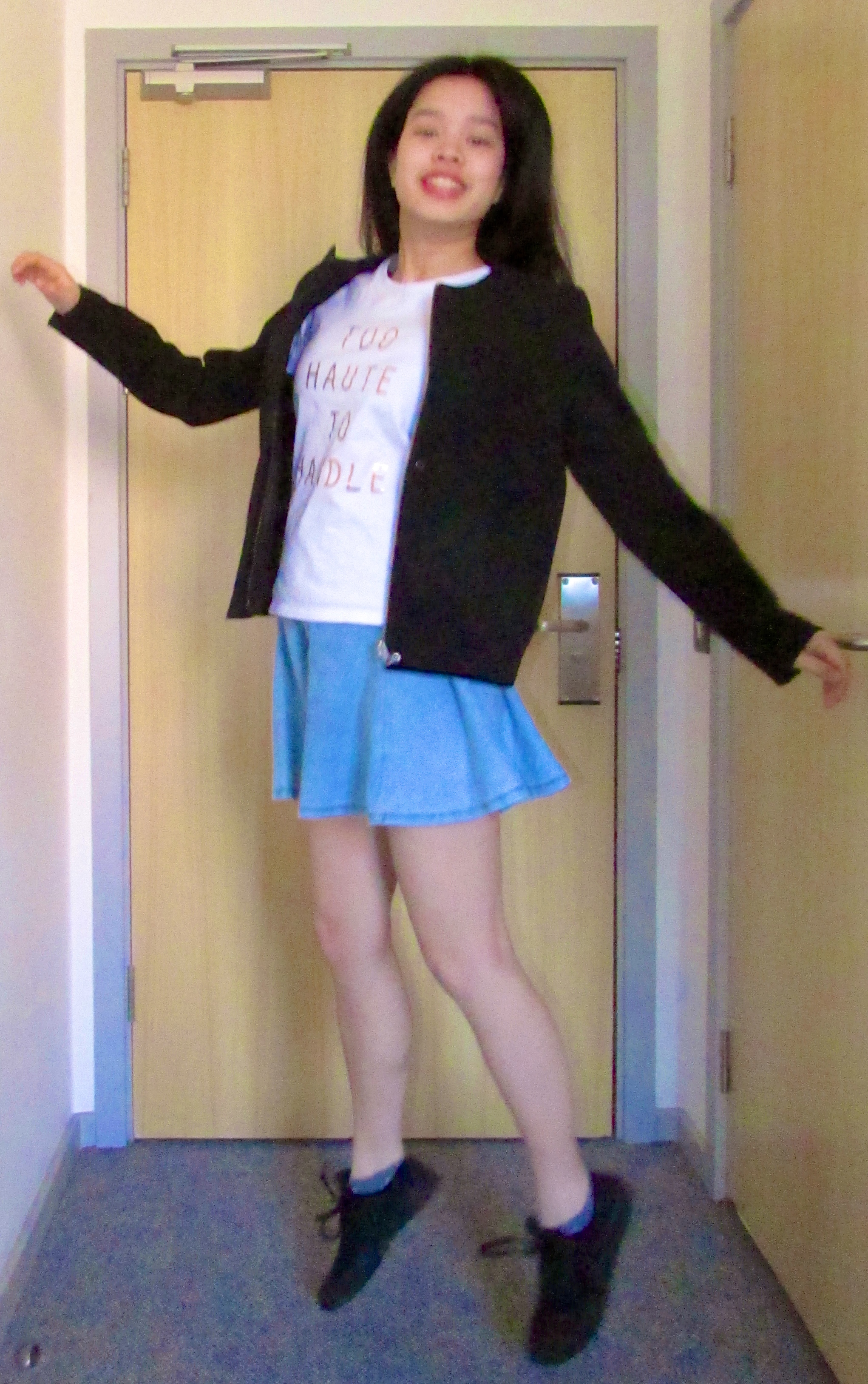 White logo tee, black converse, and washed-out jean A-line skirt. Pretty and simple with a touch of summer, but I kept it from going all the way summer with my black bomber. England is a lot warmer than I’m used to March weather being, so I don’t mind having a summer outfit at all. Pretty much everything above the knee was from TopShop this time around.