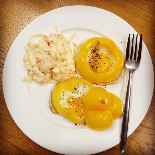 Quick and easy is how I like cooking. Yay for a picture I found somewhere on the internet (I forget where) that looked like it was both. So I tried out my own variation of the internet-famous “Egg-Filled Pepper” and had a lovely lunch.