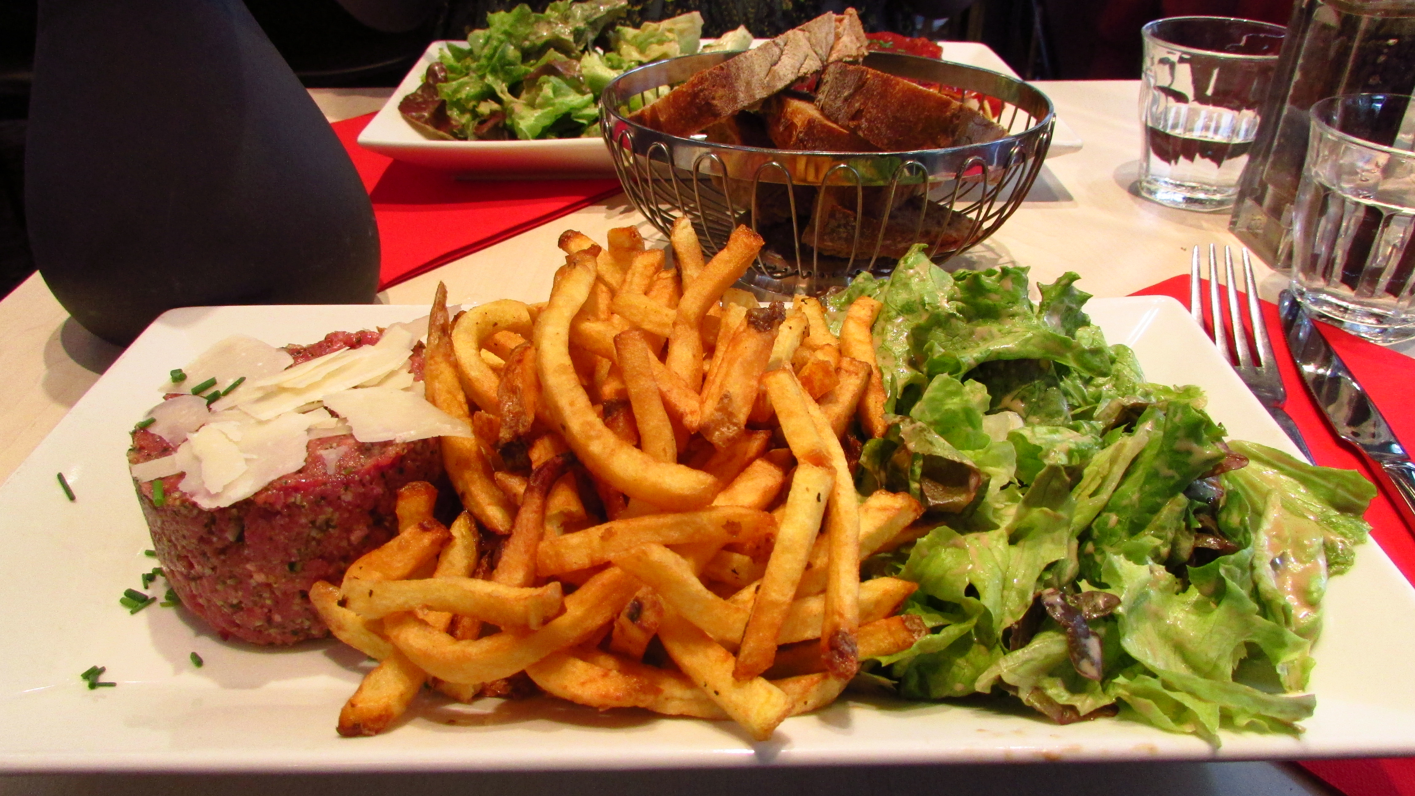 Afterwards, we found the nearest metro station and returned to the area near our hostel. From there we set out in search of something for dinner and found a nice place that was far enough from Sacré-Coeur that it wasn’t overpriced. I had tartare for the first time in my life, followed by some delicious crème brulée, and then we returned to our new room.