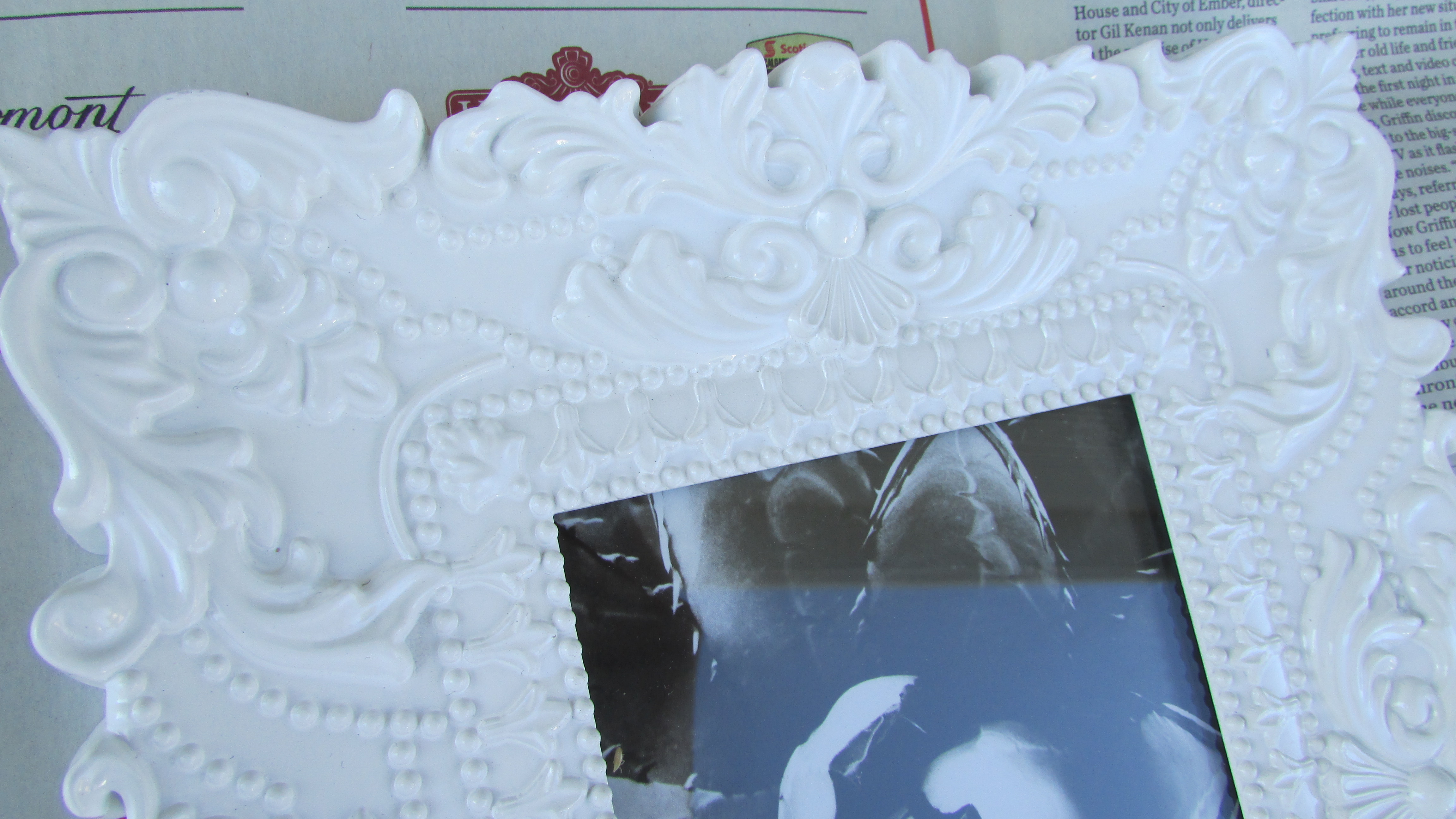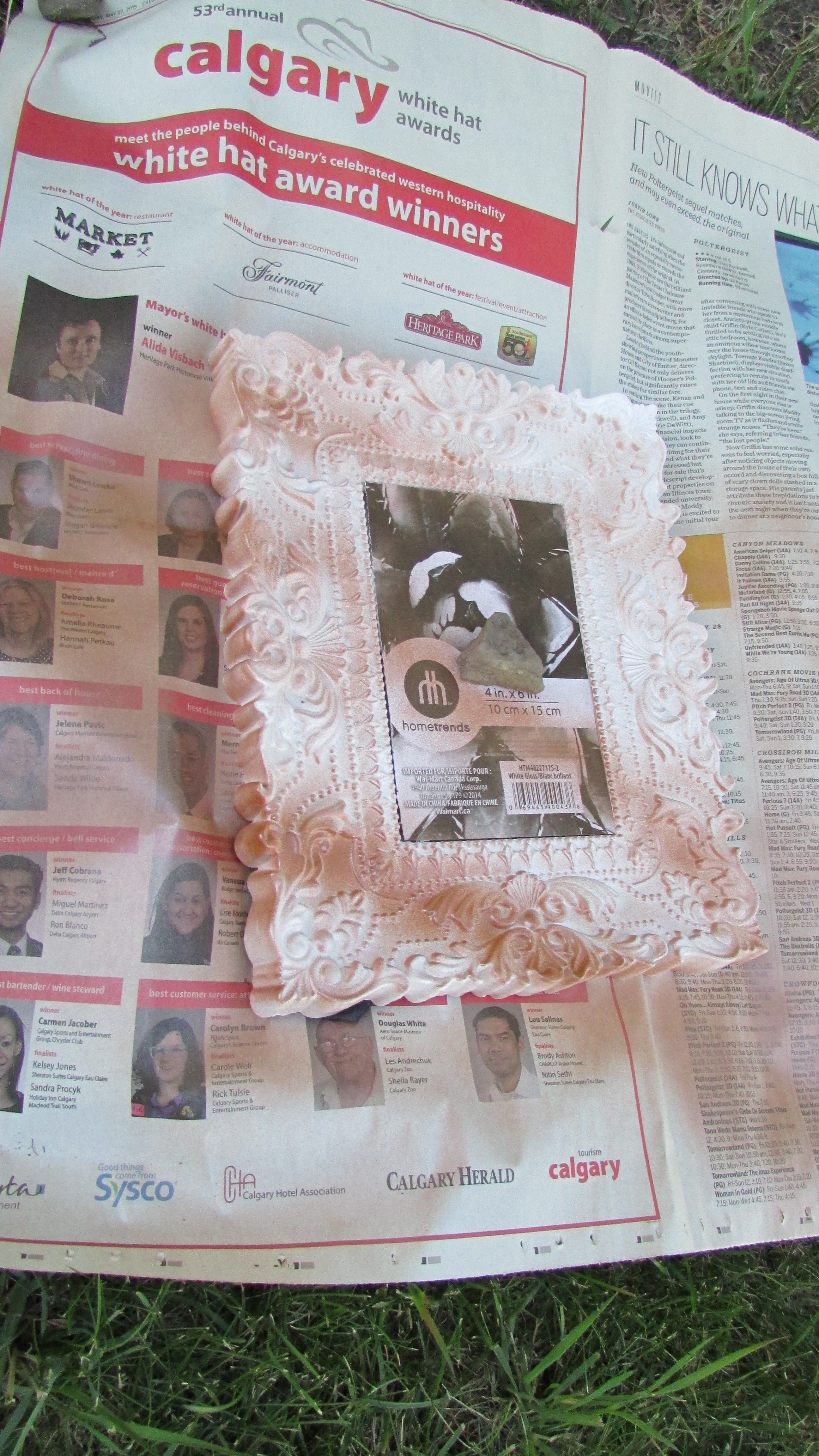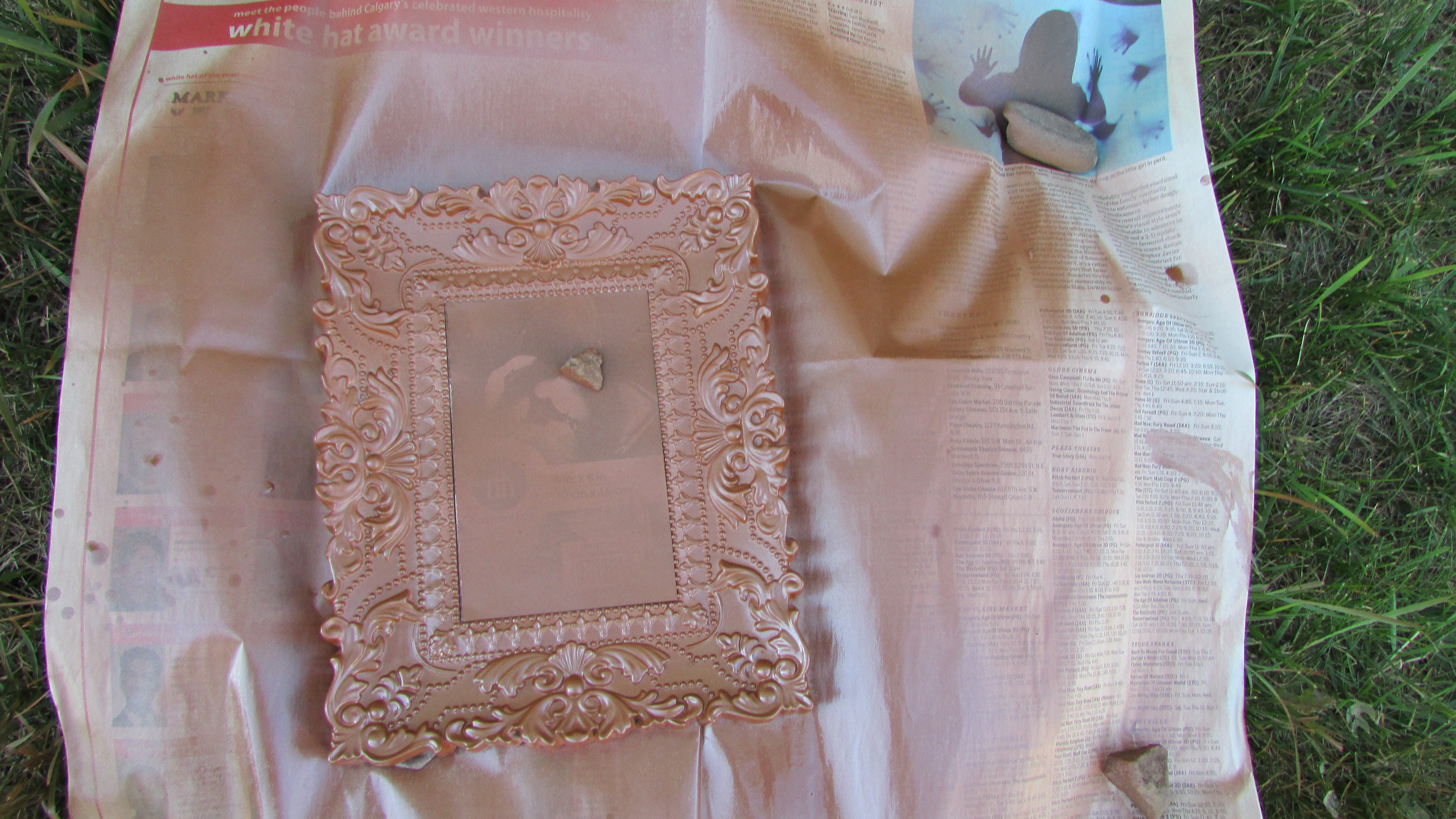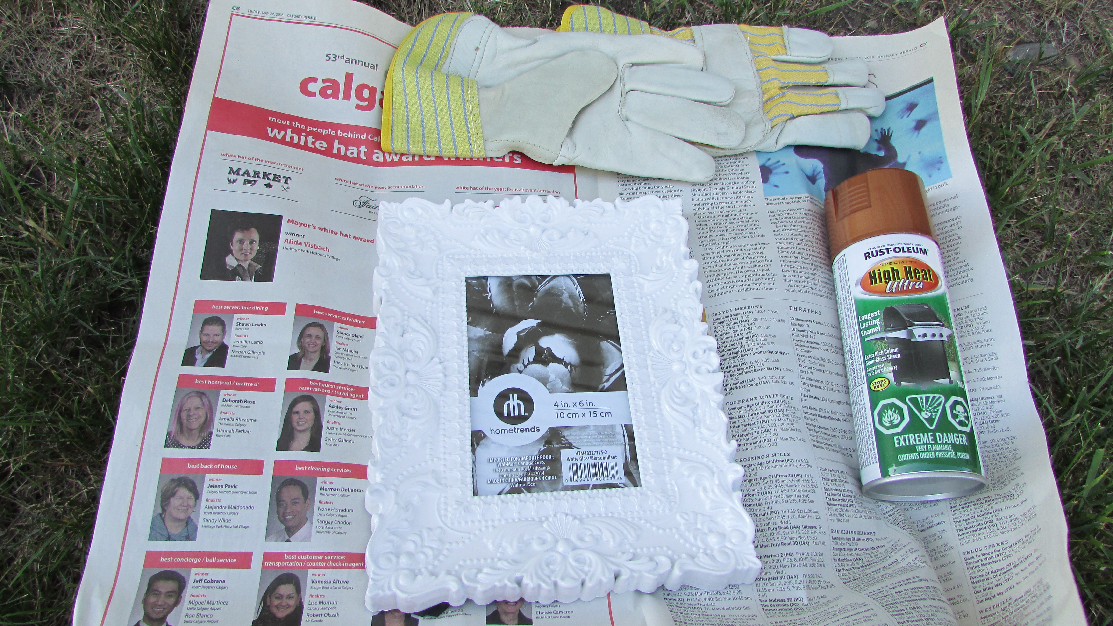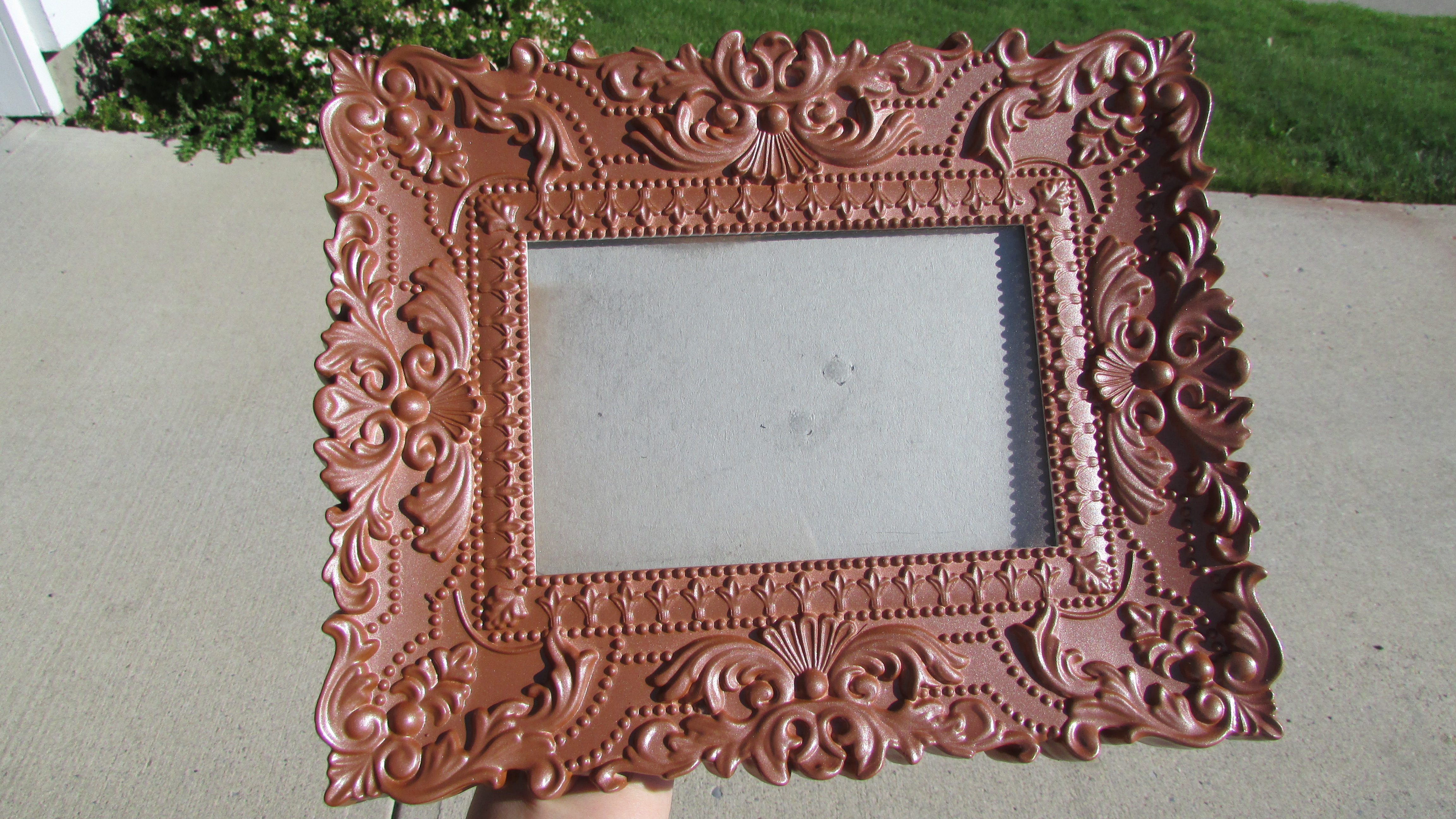 I went outside because I needed somewhere well-ventilated. I found the picture frame at Walmart for $10 and although I loved the baroque-style detail, the fact that it was all white made it look cheap.
