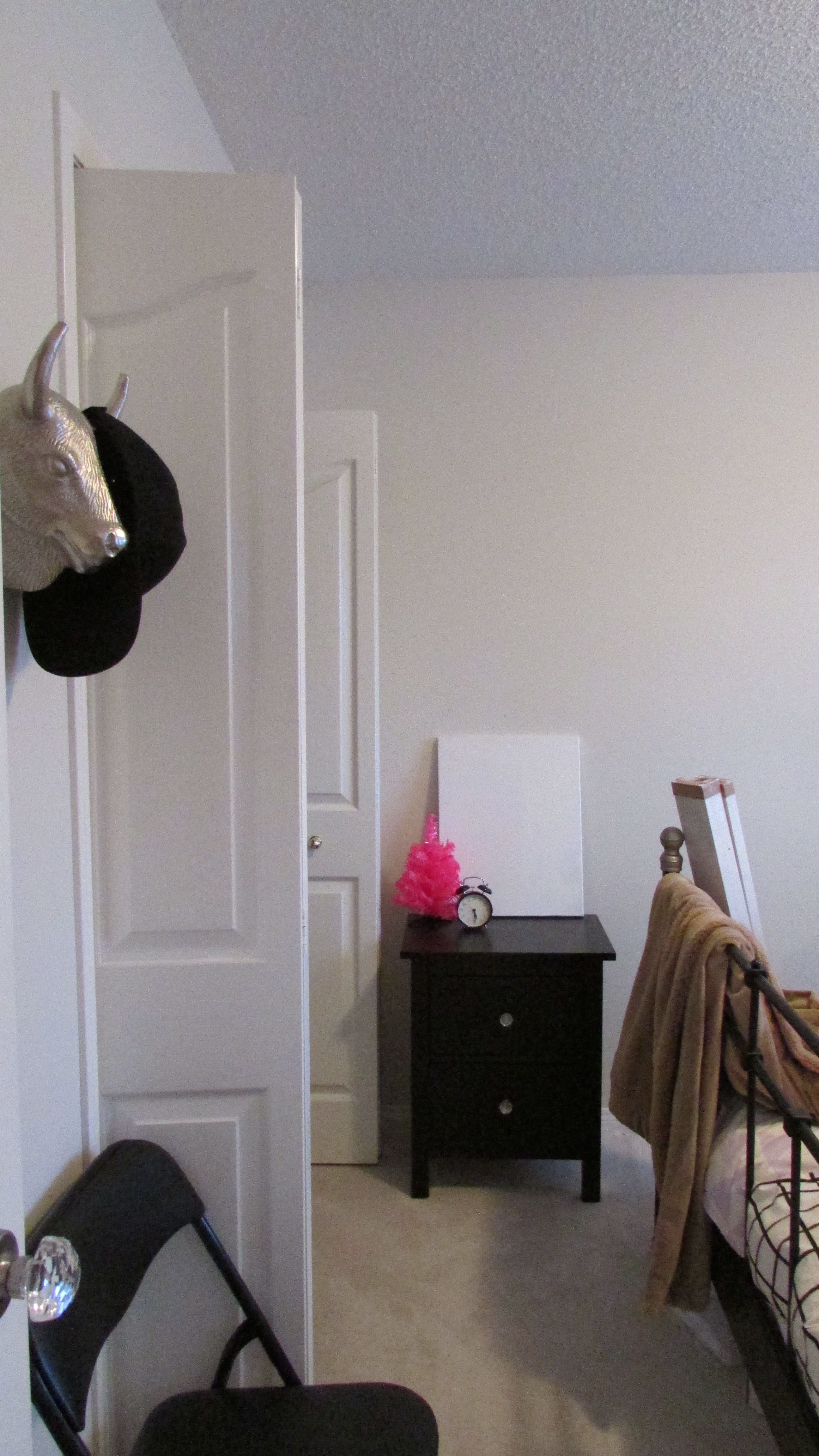 If you haven’t been around very long, here’s the room I started with a year ago. The walls and the carpet were beige, and I had a door, an unremarkable window, and a closet.