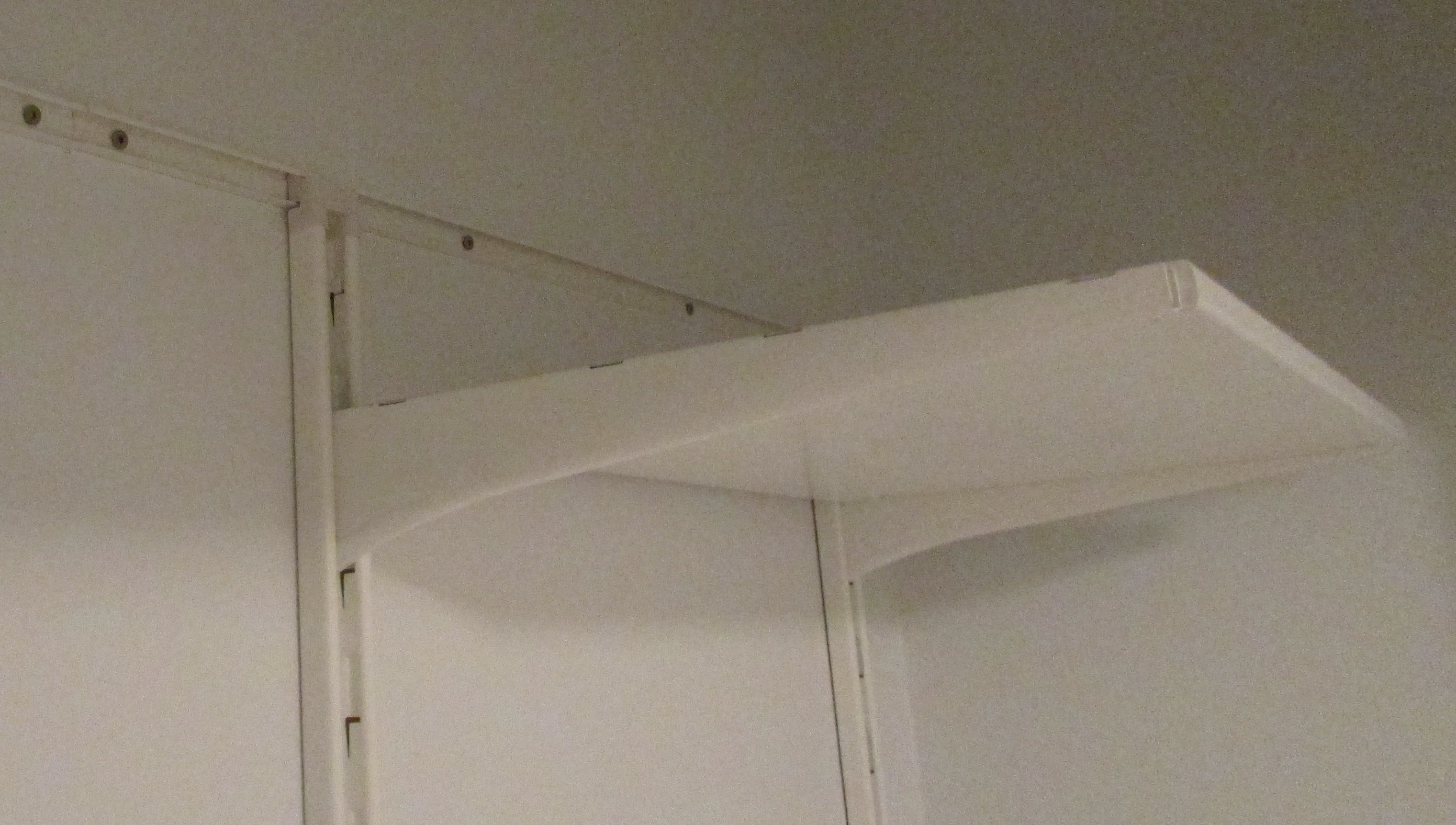 The closet had doors and a single wire shelf inside. It was nearly useless and it took too much space, which I didn’t have much of to begin with. I took the doors out over my winter break, I think. That helped a bit, but the closet wasn’t much to look at.