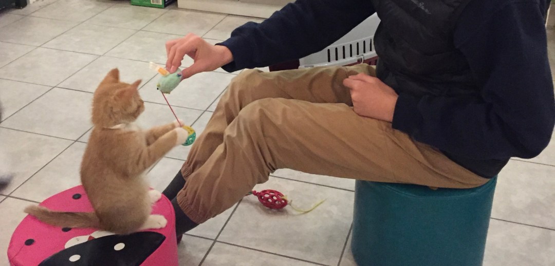 After I finished a sandwich and my tea, I washed my hands and went into the cat play area. There were a bunch of kittens inside, all either available for adoption, pending adoption, or recently adopted and waiting for their new owners to pick them up. About eight kittens in total. Some were very playful and I enjoyed playing with them for a good half hour or so. They were kind of crazy, some climbing me and running around the enclosure chasing toys. Some were asleep, some were getting pets from other café patrons. After a while, I left the hyper cats for some kids to play with and I sat on the other side of the room to watch. That’s when he came up to me.