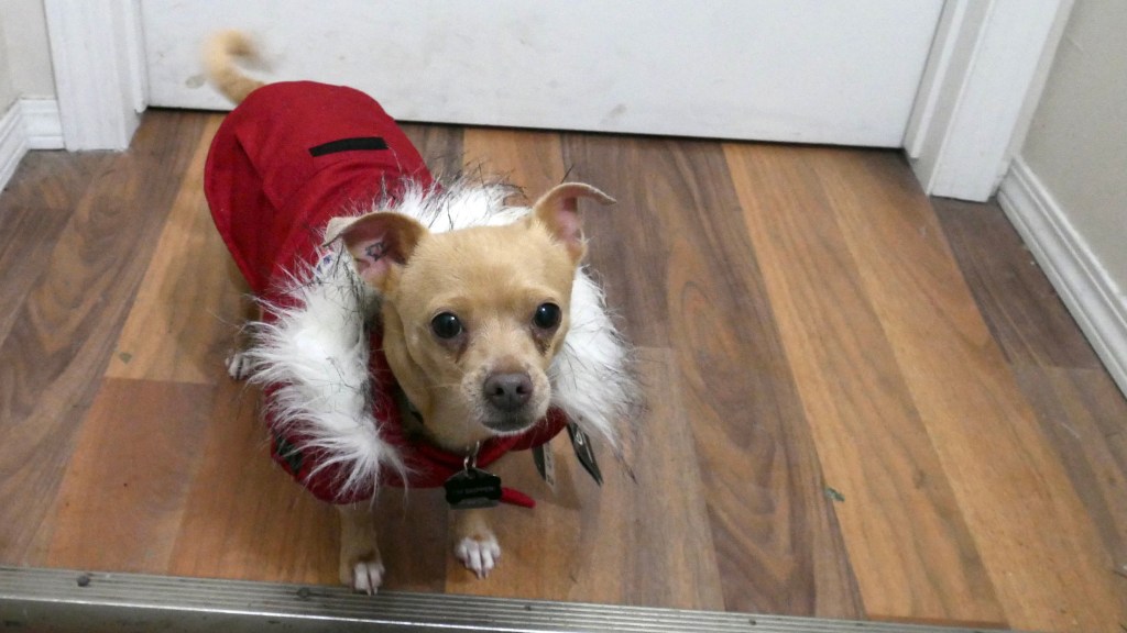 When I finally get inside and Skipper greets me, it’s hard to tell which one of us is happier. I shovel a little bit more at the door (but not a ton because I’m gonna be sore tomorrow as it is) and we go out to test her new coat. She walks on her two back feet because she hates snow but hates booties more. She doesn’t run from snow like she does booties. As a biped, she is once again taller than the snow, just for now. We go back inside after two minutes. It’s not as cold as it is snowy, but it’s still notable that my California girl doesn’t shiver. However, the coat is both too big and too short on her. I ponder her breed mix as I take it off.