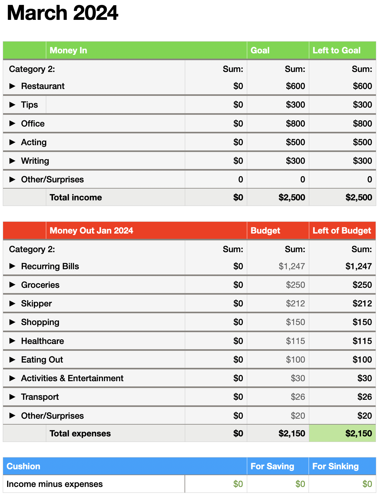 My objective with this budget is to be able to predict and control how much I will spend as well as allow myself the freedom to spend within those budgets. Allocating money specifically for things like eating out, shopping, or entertainment helps to alleviate the guilt of spending on what may not be basic necessities but do improve my quality of life in significant ways. Every month for two months now, I’ve tweaked the budget for accuracy. I’ve gone over-budget both months, which tells me I’m not budgeting enough for things, so I’m upping it from $2k to $2150. On the other hand, I’ve increased my income goal from $2k to $2500, with specific targets for each of my income streams. So this is my budget for March:
