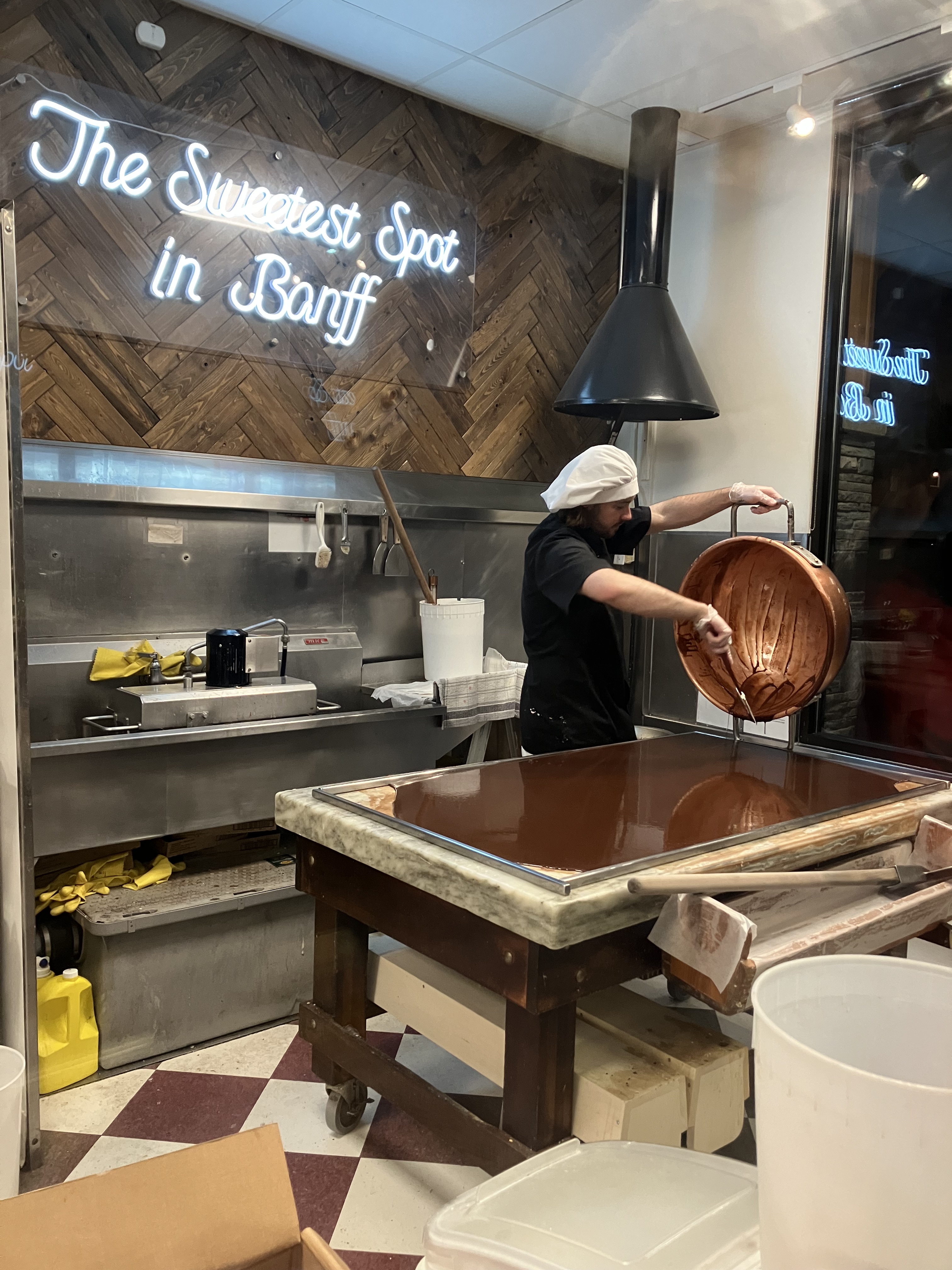 In the town of Banff itself, my family and I usually walk the main boulevard, checking out all the shops along the way and testing our IQs on the bear-proof garbage cans. We saw an elk in town this time around, too. One of our favourite restaurants in town is Grizzly House, a meat-lover’s paradise for hot rocks and fondue dining which I highly recommend getting a reservation to, unless you don’t mind waiting an hour for a patio table. The Fudgery is a notable sweet shop nearby for how the workers make their goods right in the front window for all to see. There’s also the Banff Museum, which has been closed every time I’ve been in the area with time to spare, so I’ve never been but I’ve heard good things. And if you’re not familiar with Canada, I recommend Beaver Tails as your official Canadian dessert intro.
